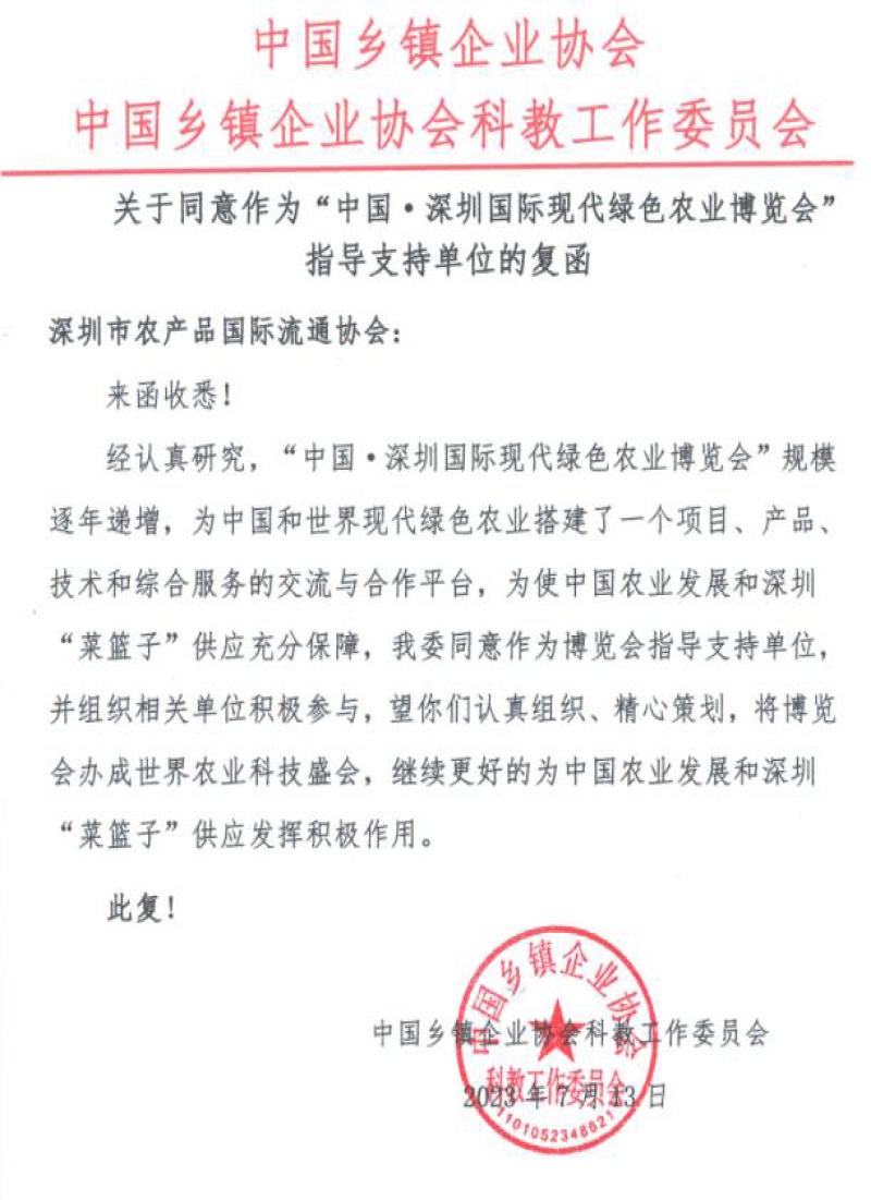 關(guān)于誠(chéng)請(qǐng)中國(guó)鄉(xiāng)鎮(zhèn)企業(yè)協(xié)會(huì)作為“中國(guó)·深圳國(guó)際現(xiàn)代綠色農(nóng)業(yè)博覽會(huì)”指導(dǎo)支持單位的請(qǐng)示復(fù)函